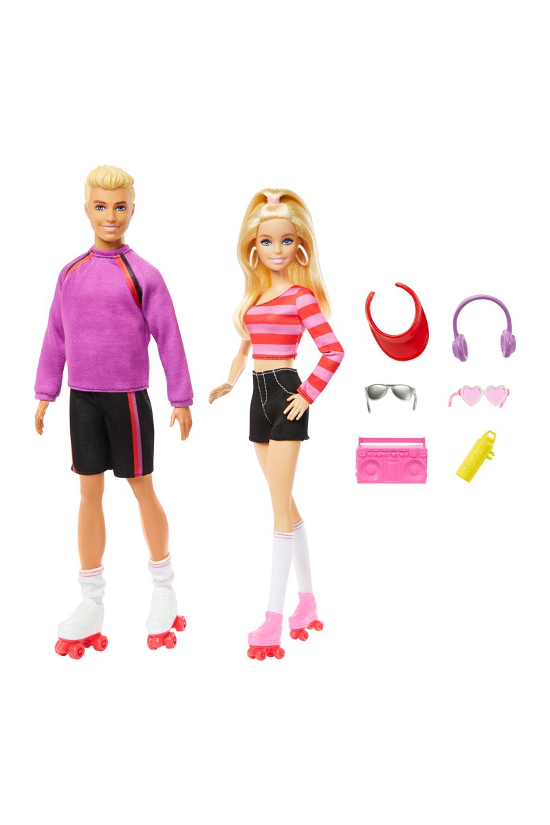 Geïnspireerd door de iconische schaatslooks van de jaren 80, stimuleert deze set van 2 poppen de verbeelding van kinderen met Barbie en Ken op rolschaatsen.