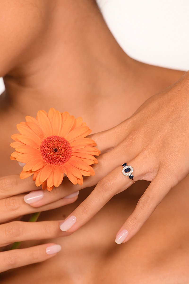 Materiaal: witgoud 375/1000, diamanten 0,099 karaat/18 en saffieren 0,85 karaat/3