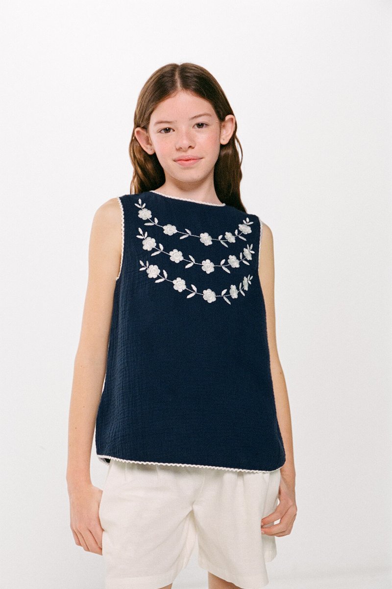 Geborduurd bloemmotief aan de voorkant.
