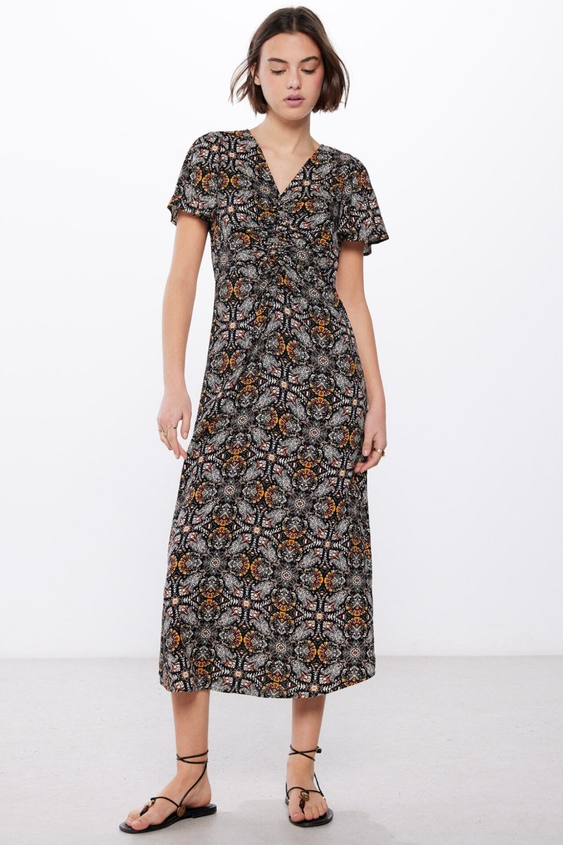 Lange jurk met korte mouwen.