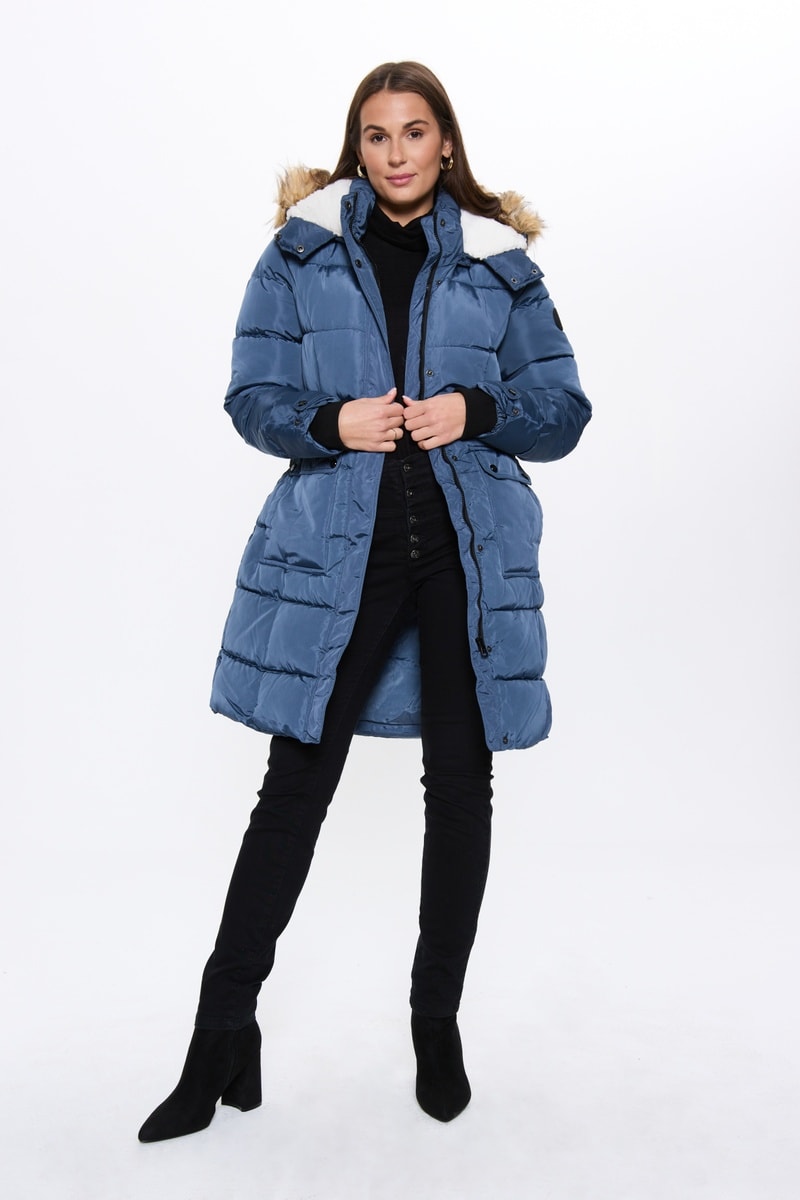 Lange gewatteerde jas met drukknoop capuchon en imitatiebont.