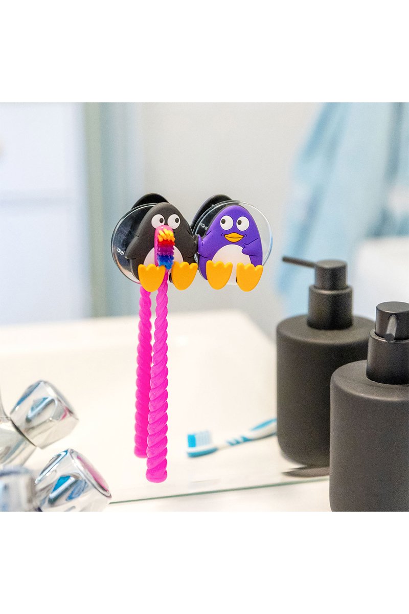 Dubbele tandenborstelhouder voor aan de muur Ani-Toothi Double Penguin- Zwart en Paars