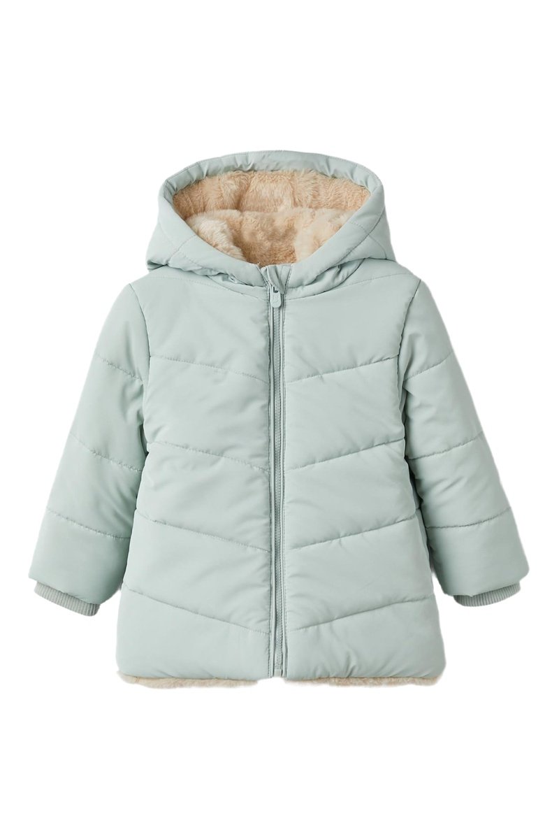 Gewatteerde jas met capuchon en imitatiebont - Lichtgroen