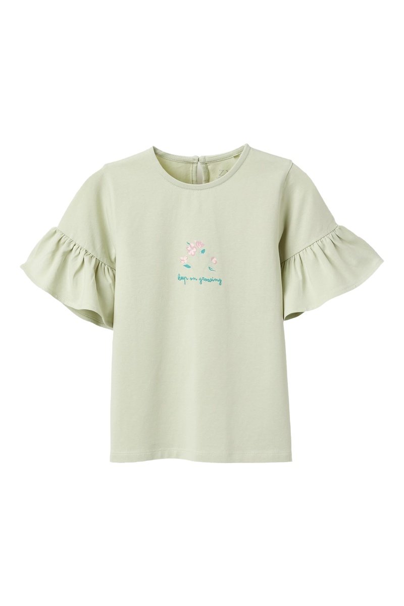 Geborduurde belettering en bloemenmotief aan de voorkant.