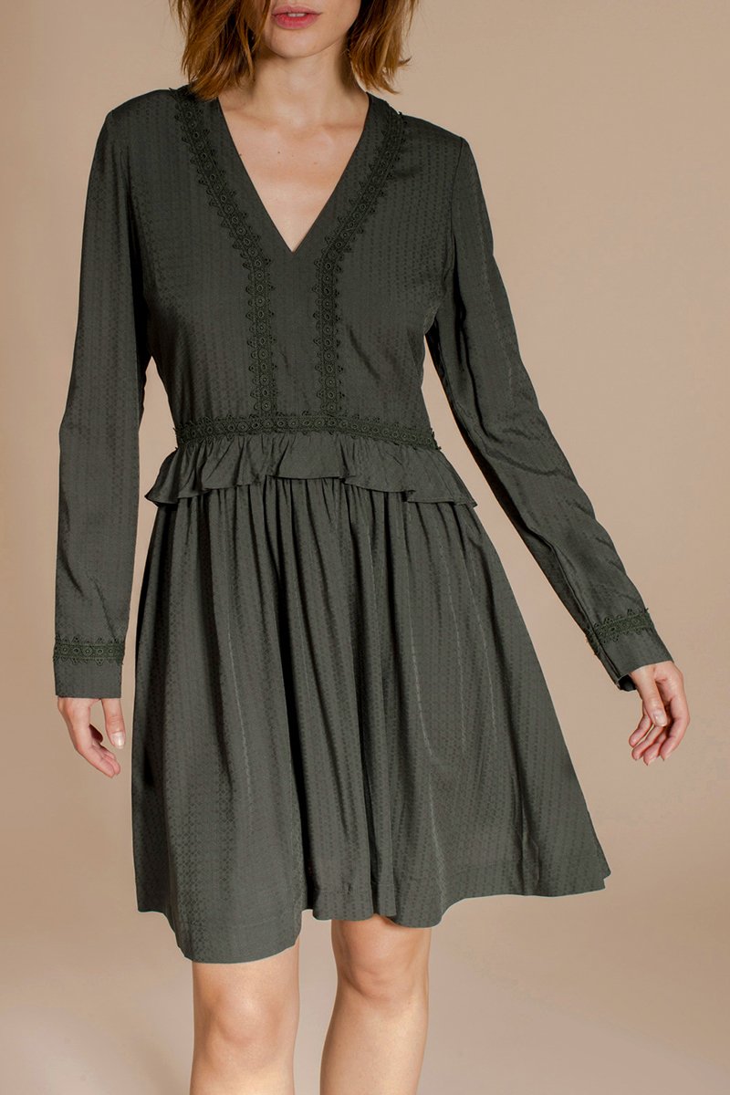 Details van guipurekant op de mouwen, aan de voorkant en aan de achterkant.