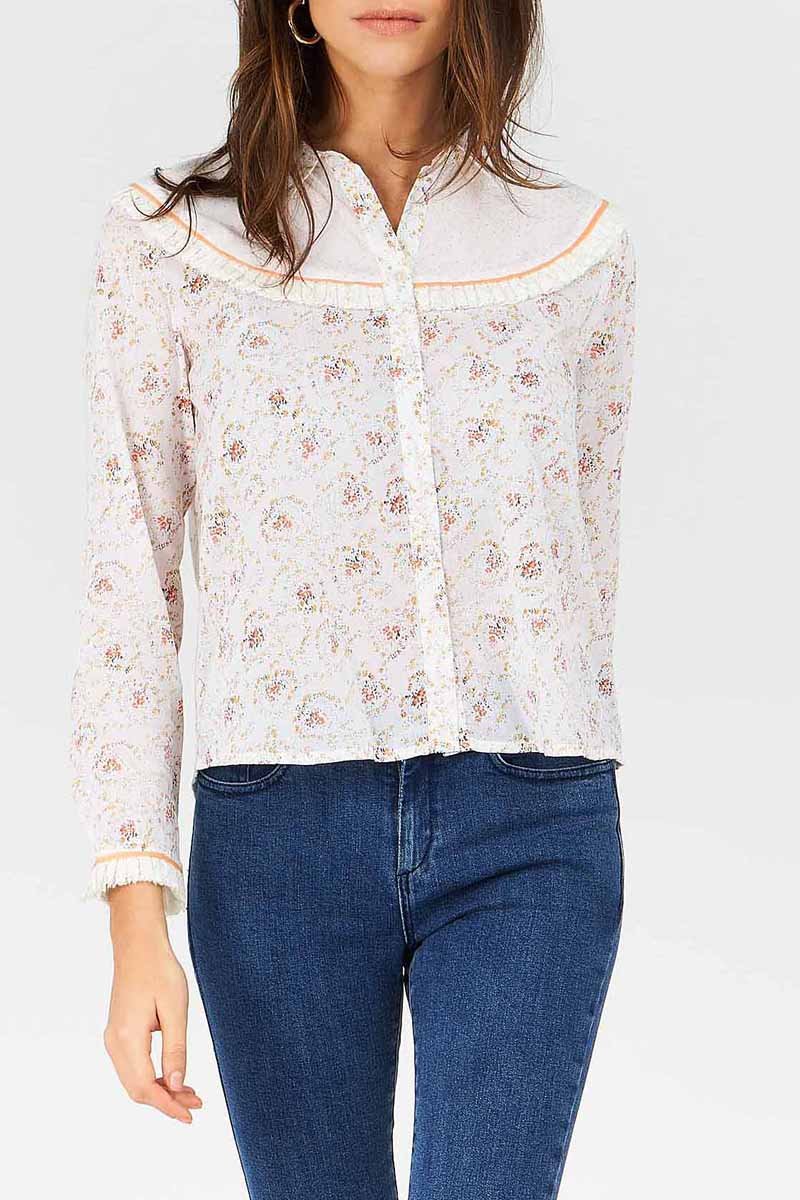 Contrasterende belijning en ruches op de mouwen, aan de voorkant en aan de achterkant.