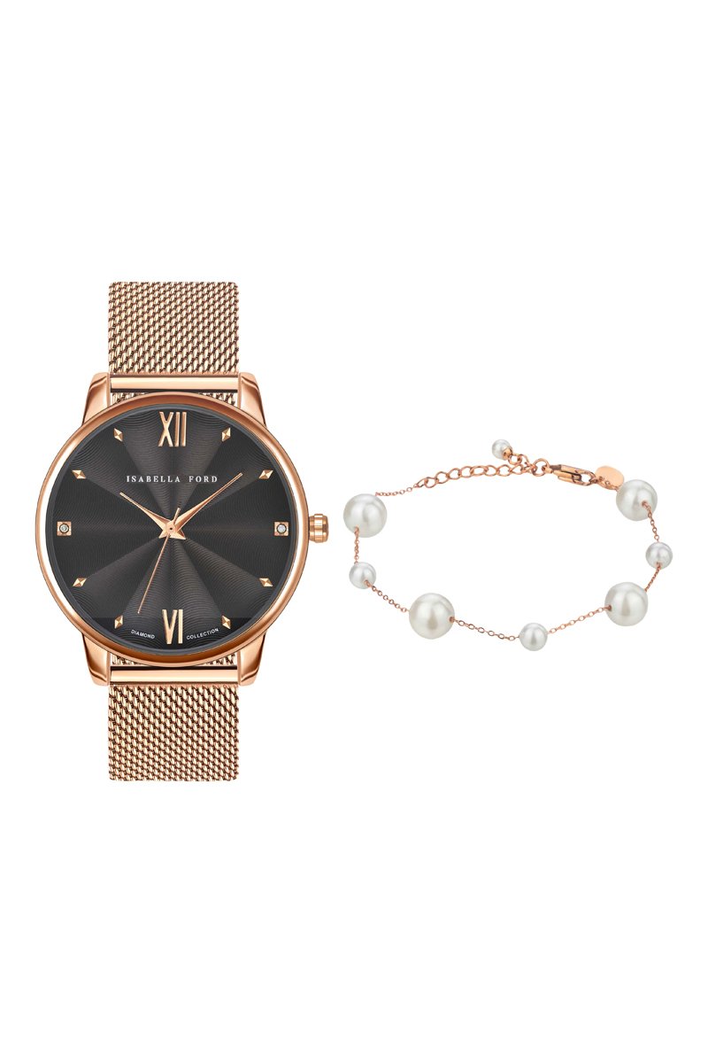 Set Stalen Quartz Horloge, diamant en armband van fijne parels Coco