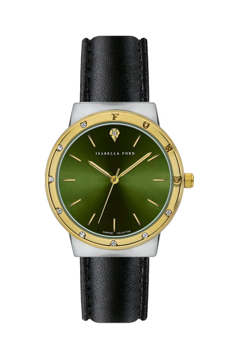 Wijzerplaat en lunette ingelegd met 9 diamanten.