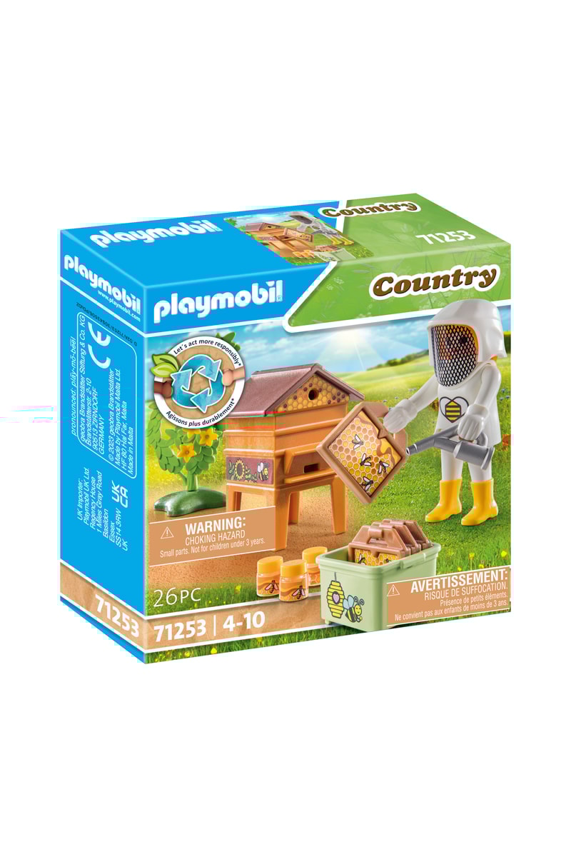 26 meegeleverde accessoires waaronder: figuurtje imker in witte beschermende kleding met helm, bijenkorf op poten, bijenkorf frame met bijen, groene doos voor bijenkasten, honingpot, bloemen.