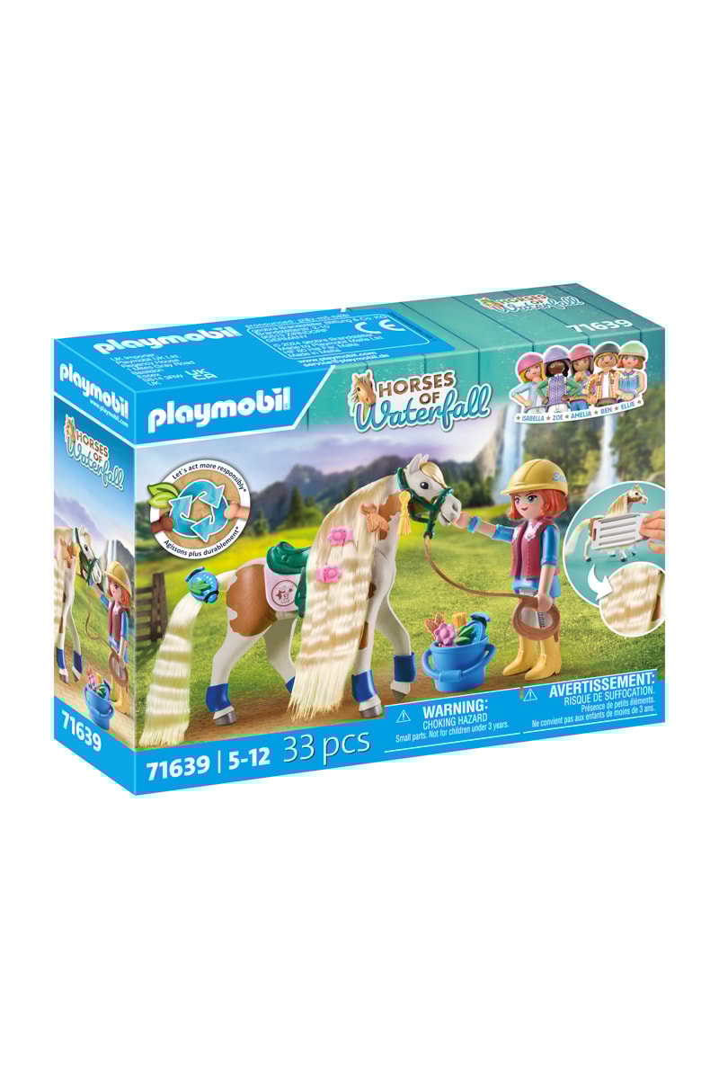 33 meegeleverde accessoires waaronder: figuurtje, paard, krultang, emmer, pins, speldjes voor het haar van je paard, 2 armbanden.