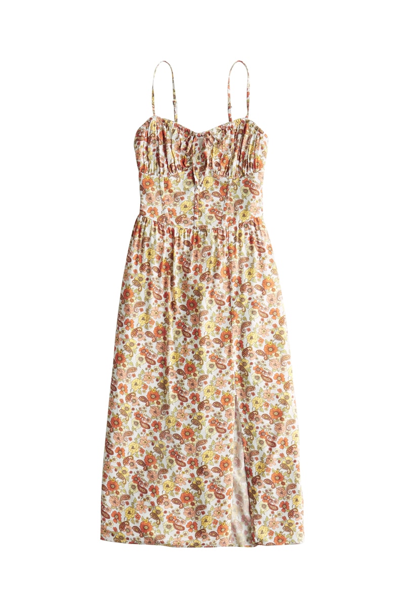 Uitsnijding, strikkoorden en split aan de voorkant.