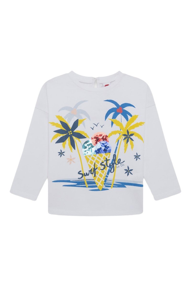 Belettering, decoratief motief, pailletten en logo aan de voorkant.