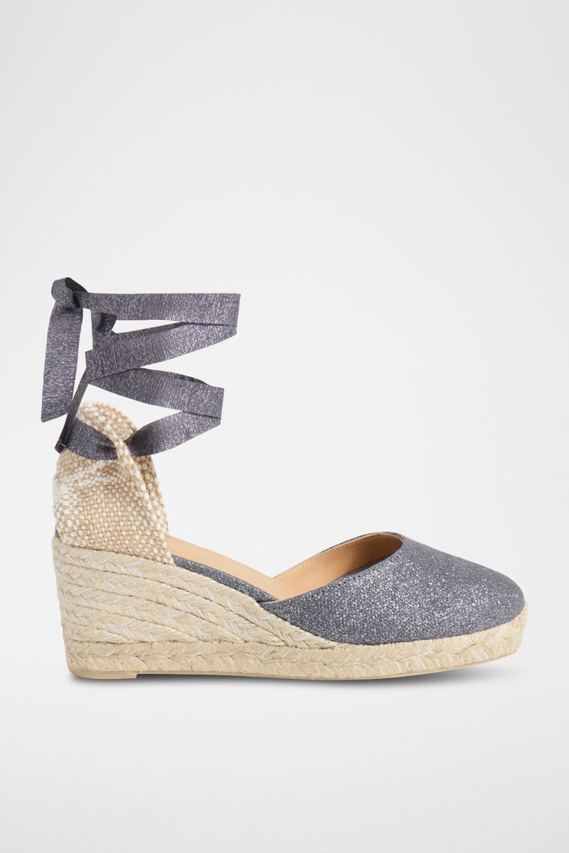 Espadrilles van glinsterend linnen met sleehak.