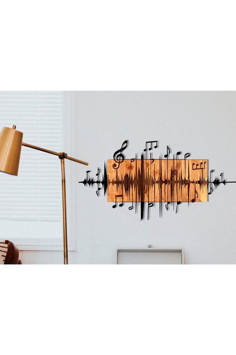 Wanddecoratie van hout en metaal.