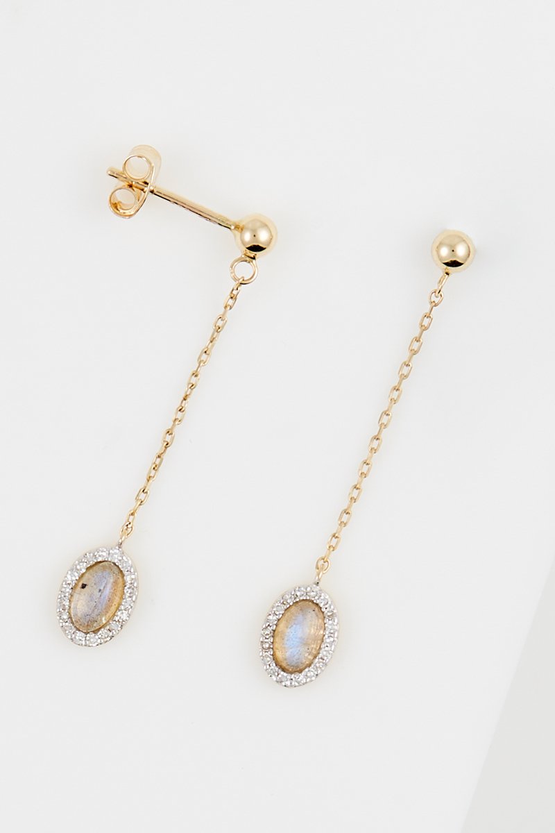 Hangende oorbellen van geelgoud ingelegd met 18 diamanten en 1 labradoriet.