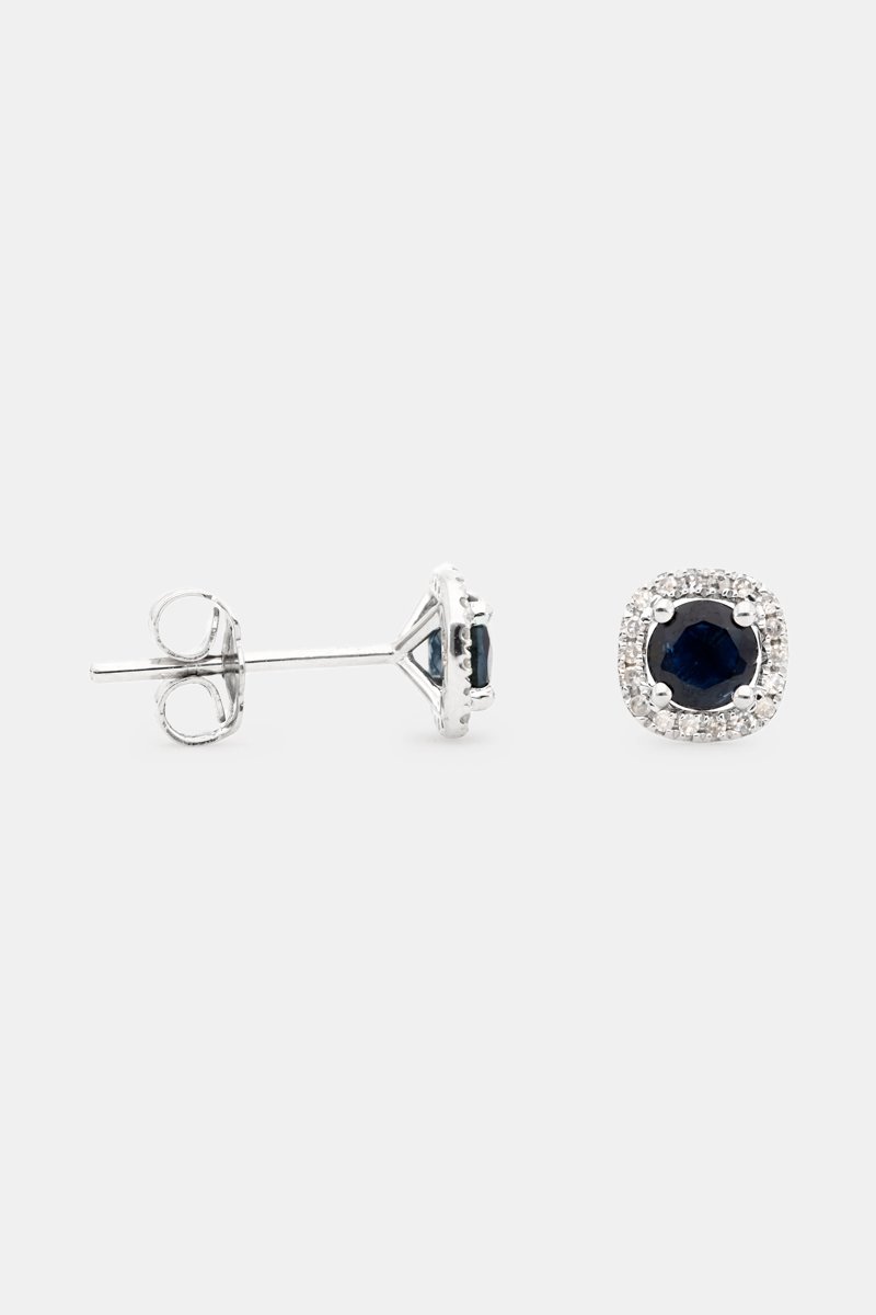 Oorbellen van witgoud ingelegd met 18 diamanten en 1 saffier.