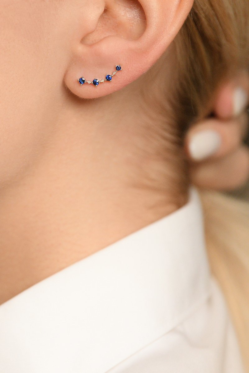 Oorbellen van witgoud ingelegd met 3 diamanten en 4 saffieren.
