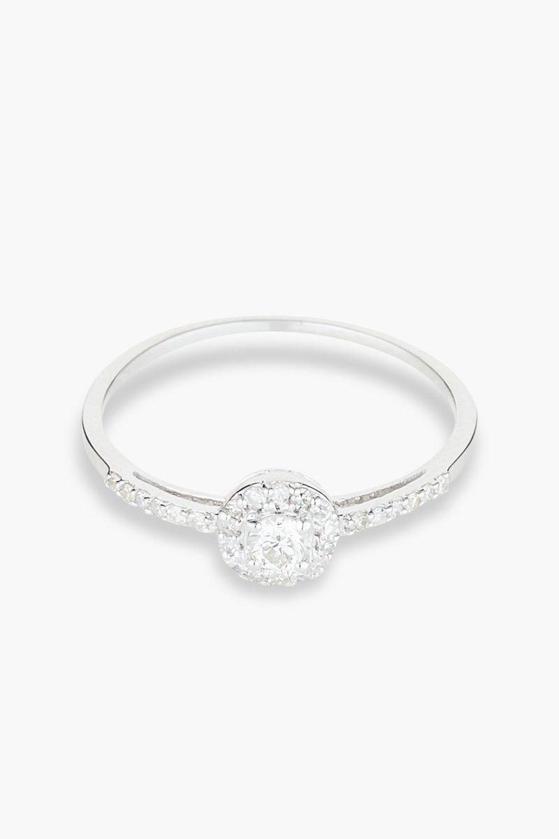 Ring van witgoud ingelegd met 27 diamanten waarvan 1 verlovingsdiamant.