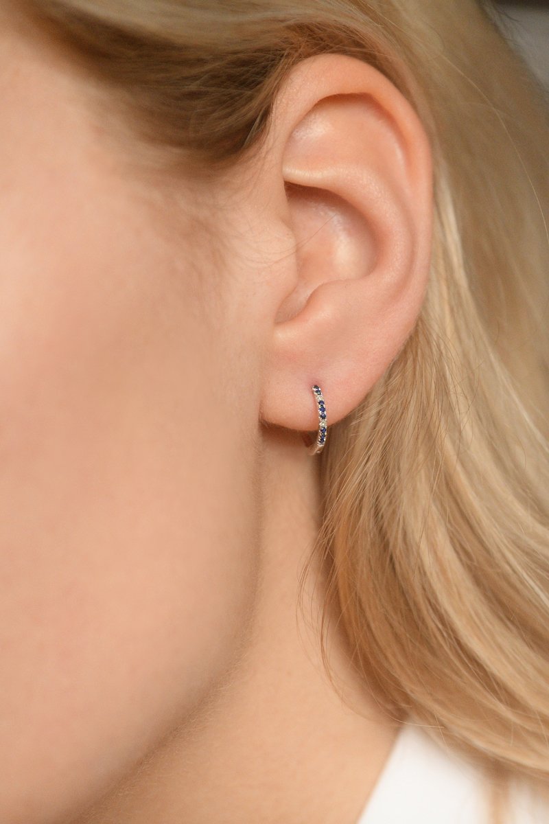 Creolen van witgoud ingelegd met 2 diamanten en 9 saffieren.