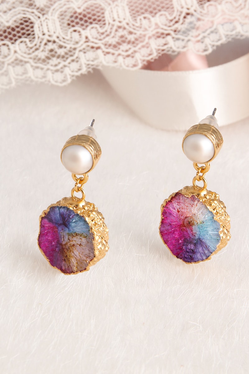 Hangende oorbellen van verguld brons met geelgoud ingelegd met 1 cultivéparel en 2 toermalijnen.