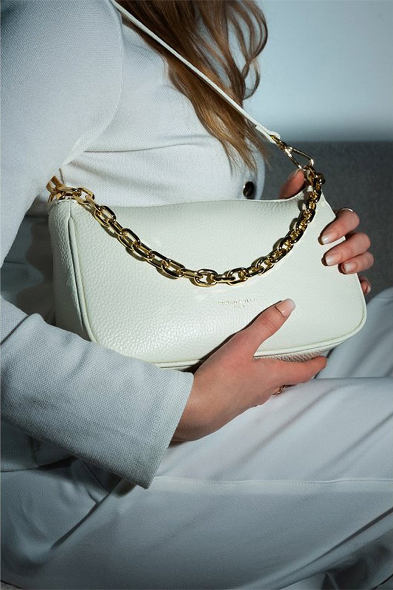 Deze schoudertas combineert elegantie en praktische bruikbaarheid met de 2 draagopties: een klassieke schouderriem voor absoluut comfort en een vergule ketting voor een verfijnde touch. De ritsopening zorgt ervoor dat je persoonlijke bezittingen veilig zijn. Binnenin bevinden zich speciale vakken voor pasjes en een vak met ritssluiting voor essentiële spullen. Een chique en tijdloos accessoire, perfect om je stijl overdag of 's avonds te laten zien.