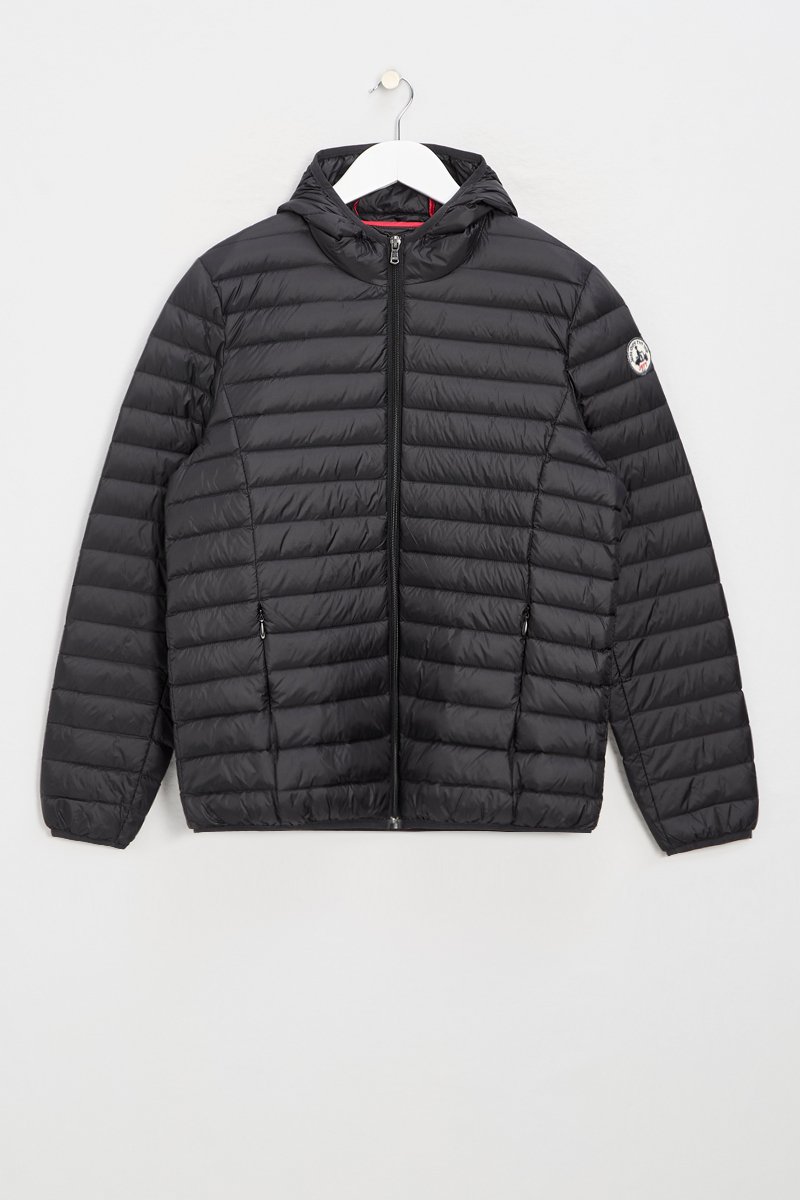 Gewatteerde jas met capuchon van dons en eendenveren.