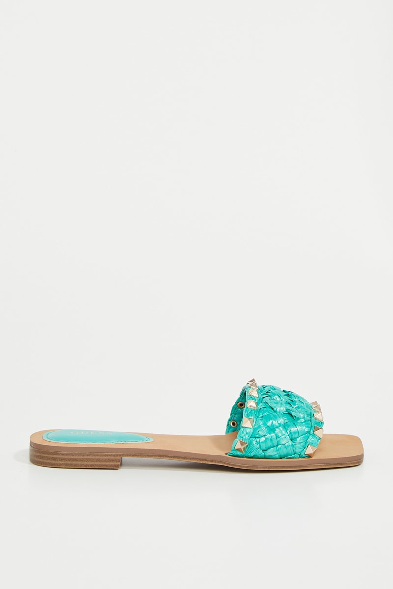Gevlochten kunstleer en metalen details aan de voorkant.