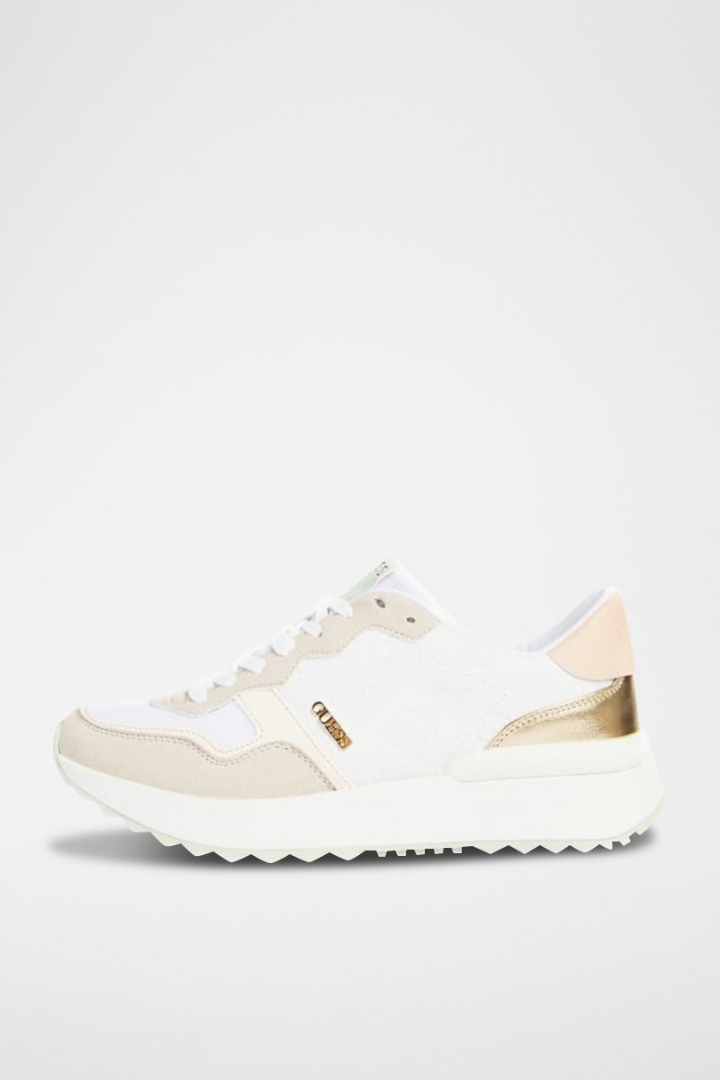 Detail met nubuck effect met logo in reliëf aan de achterkant.