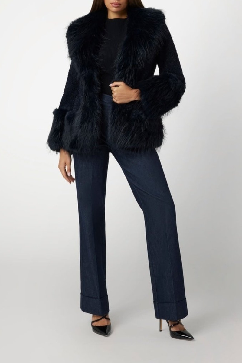Details van imitatiebont bij de hals, op de mouwen, aan de voor- en onderkant.