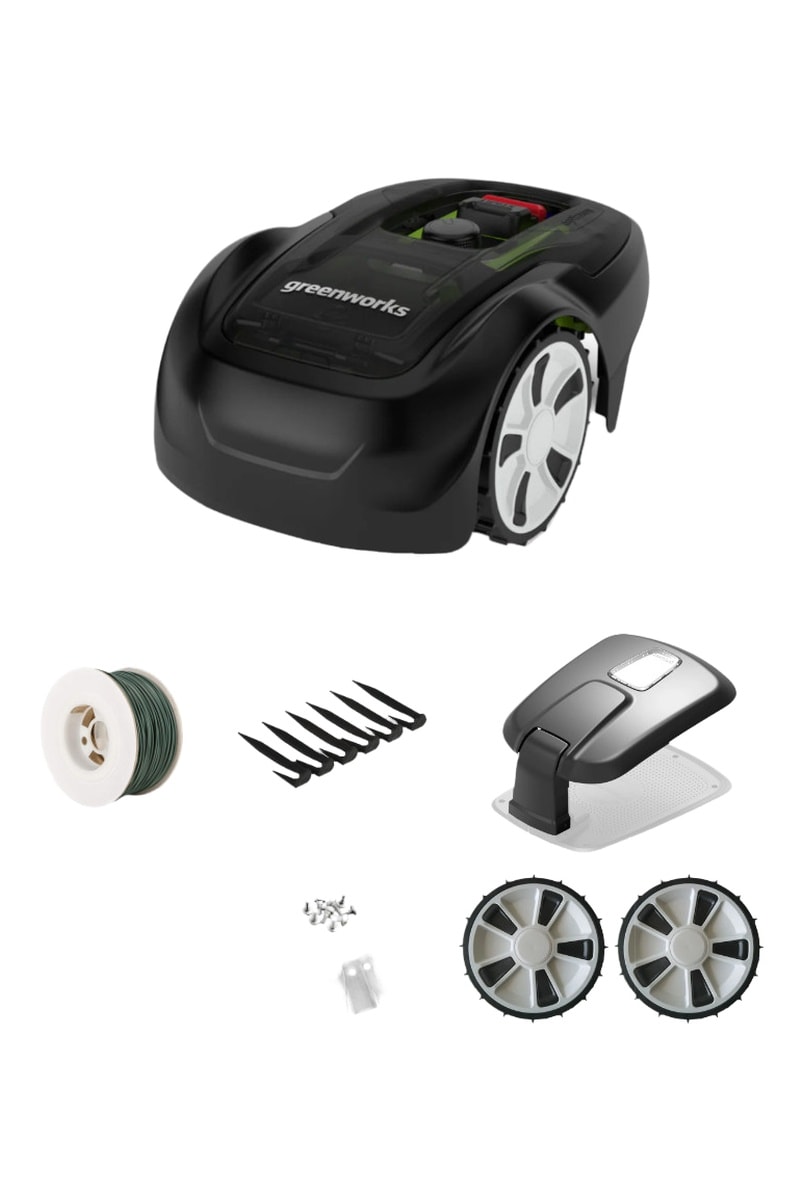 Meegeleverde accessoires: beschermingsgarage, reservemessen en -wielen, rol van 100 meter omtrekdraad, bevestigingspalen en connectoren.