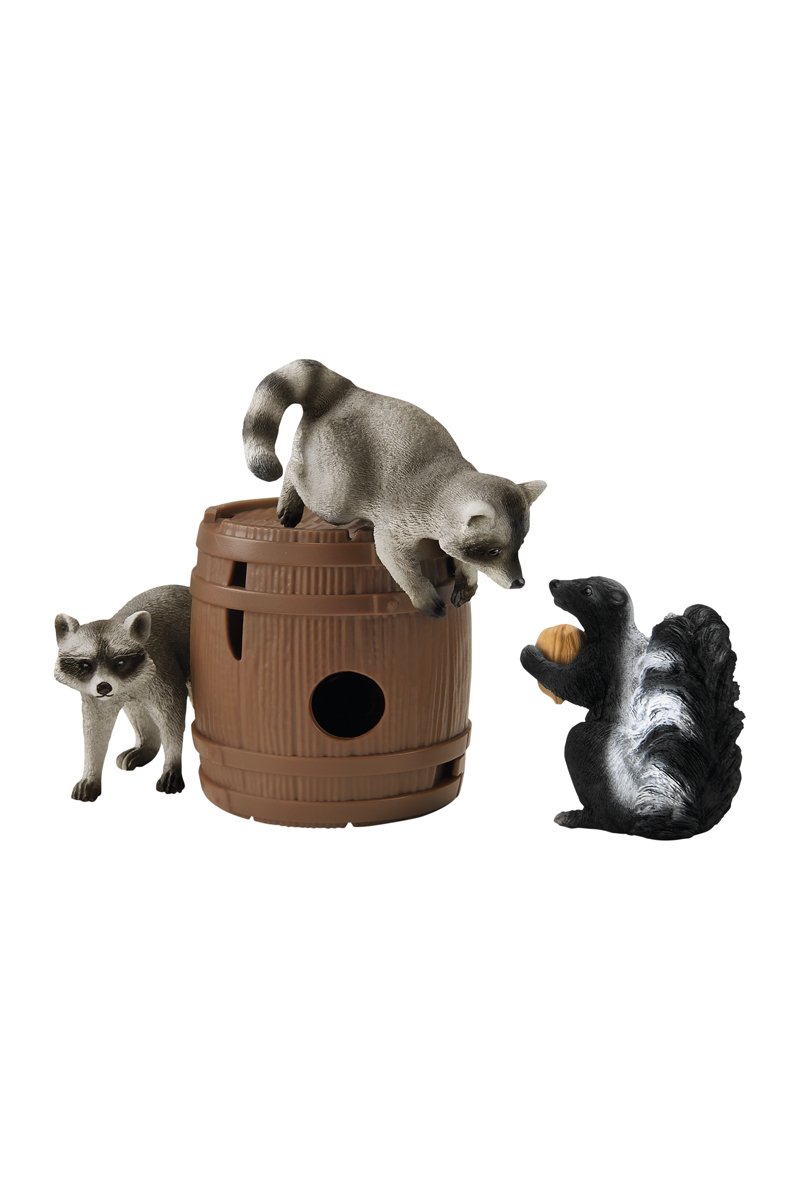De grote schleich® WILD LIFE speelpret rondom de noot kan beginnen! Het is een kwestie van snelheid: Twee ondeugende wasberen en een parmantig stinkdier hebben hun oog laten vallen op de noot! Wie krijgt ze te pakken?