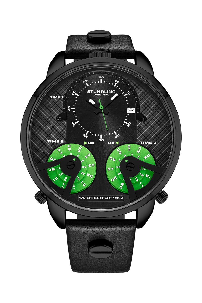 Leren Quartz Horloge - GMT-functie - Zwart en groen