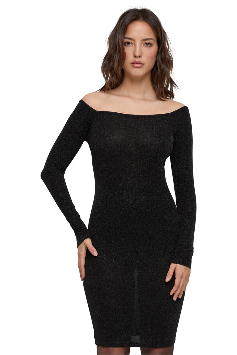 Glinsterende nauwaansluitende jurk met lange mouwen.