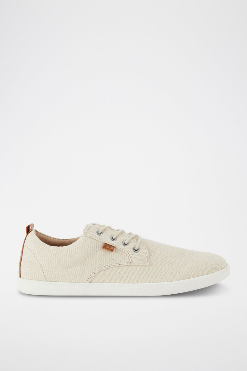 Detail van kunstleer met logo in reliëf aan de zijkant.