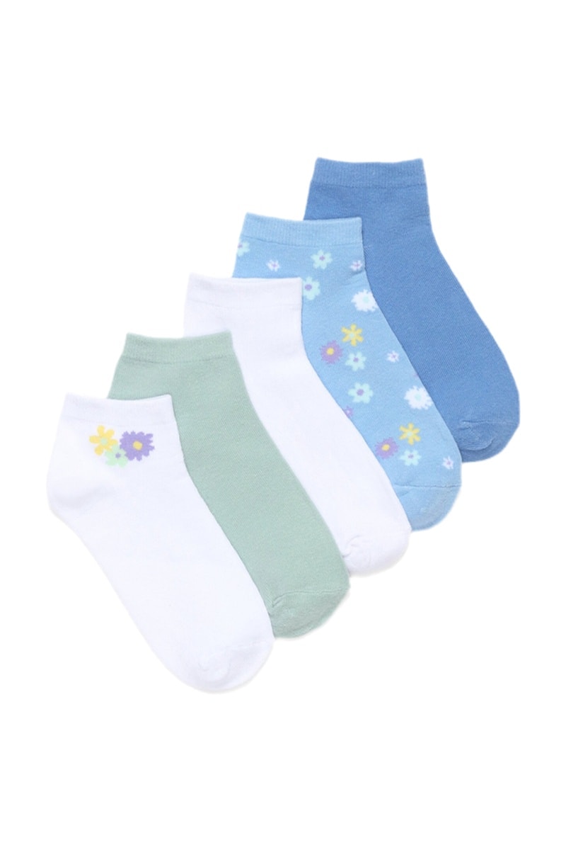 5 paar enkelsokken waarvan 1 met bloemenmotief en 1 met bloemmotief aan de zijkant.