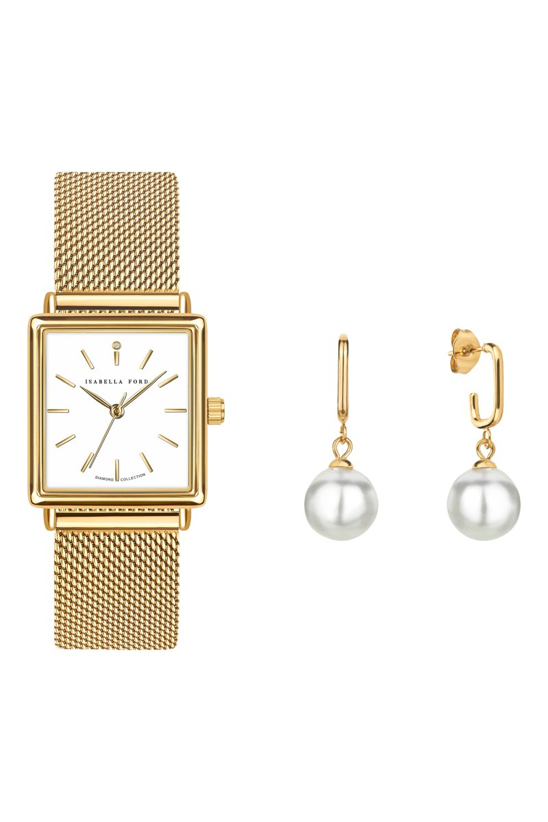 Set stalen Quartz Horloge met Diamant en oorbellen Charlotte