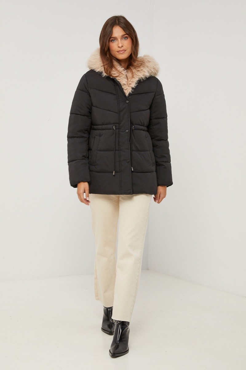 Gewatteerde jas met capuchon van imitatiebont en lange mouwen.