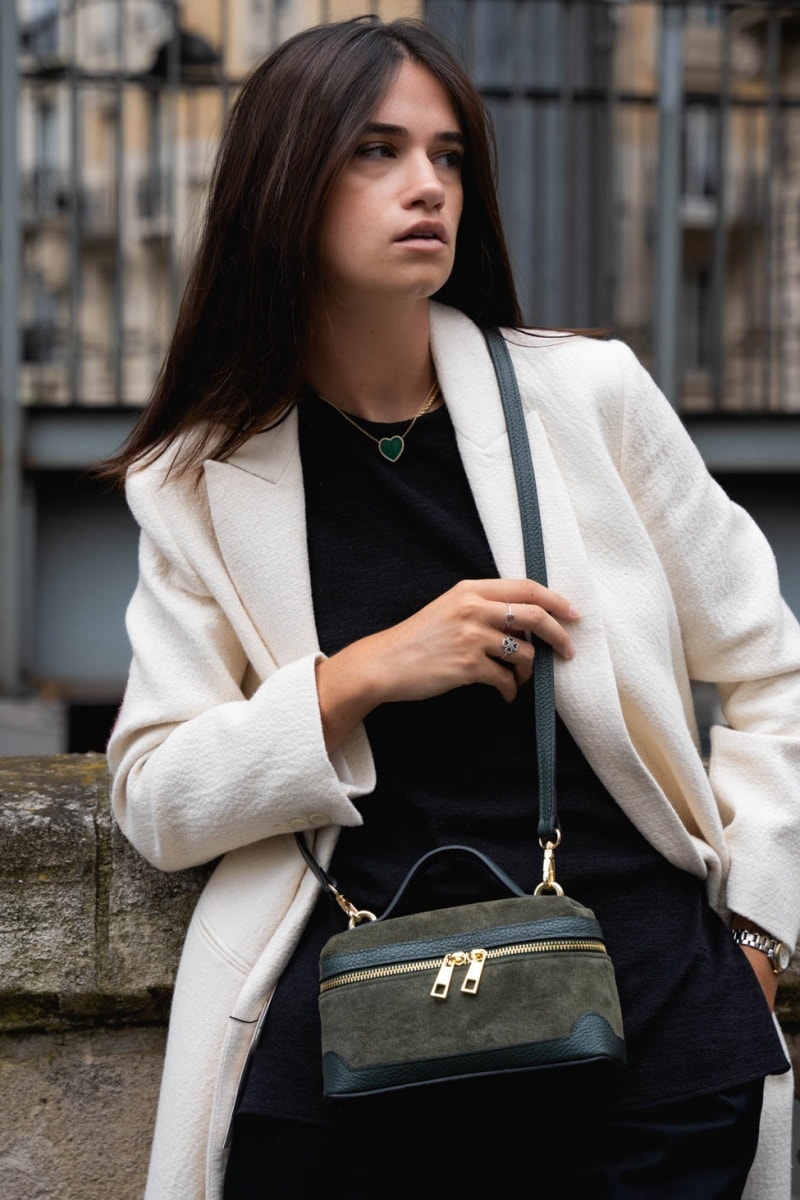 Verstelbare en afneembare schouderband van gekorreld leer.