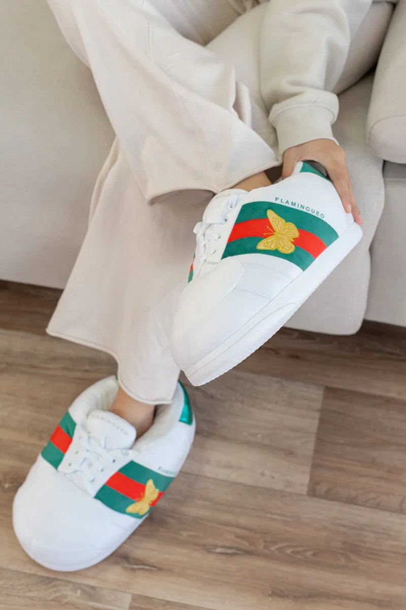 Streepmotief, geborduurde vlinder en logo aan de zijkant.