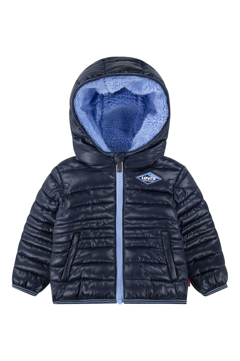 Streepmotief op de capuchon, op de mouwen en aan de onderkant.