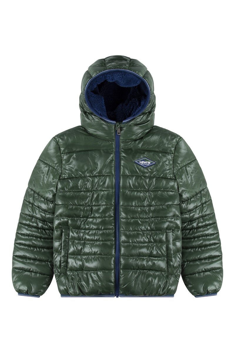 Gewatteerde jas met capuchon.