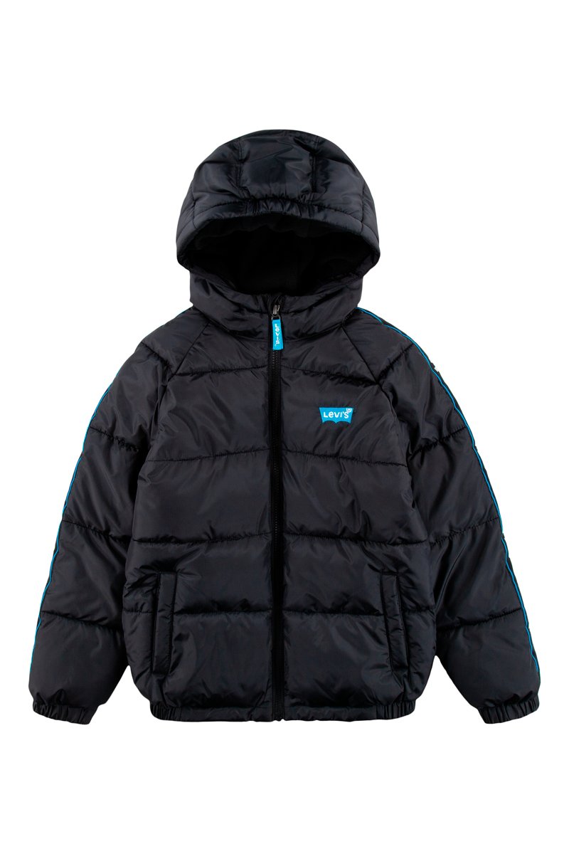 Gewatteerde jas met capuchon.
