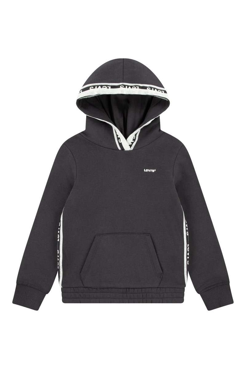 Belijning met streepmotief, glinsteringen en logo op de capuchon en de zijkanten.