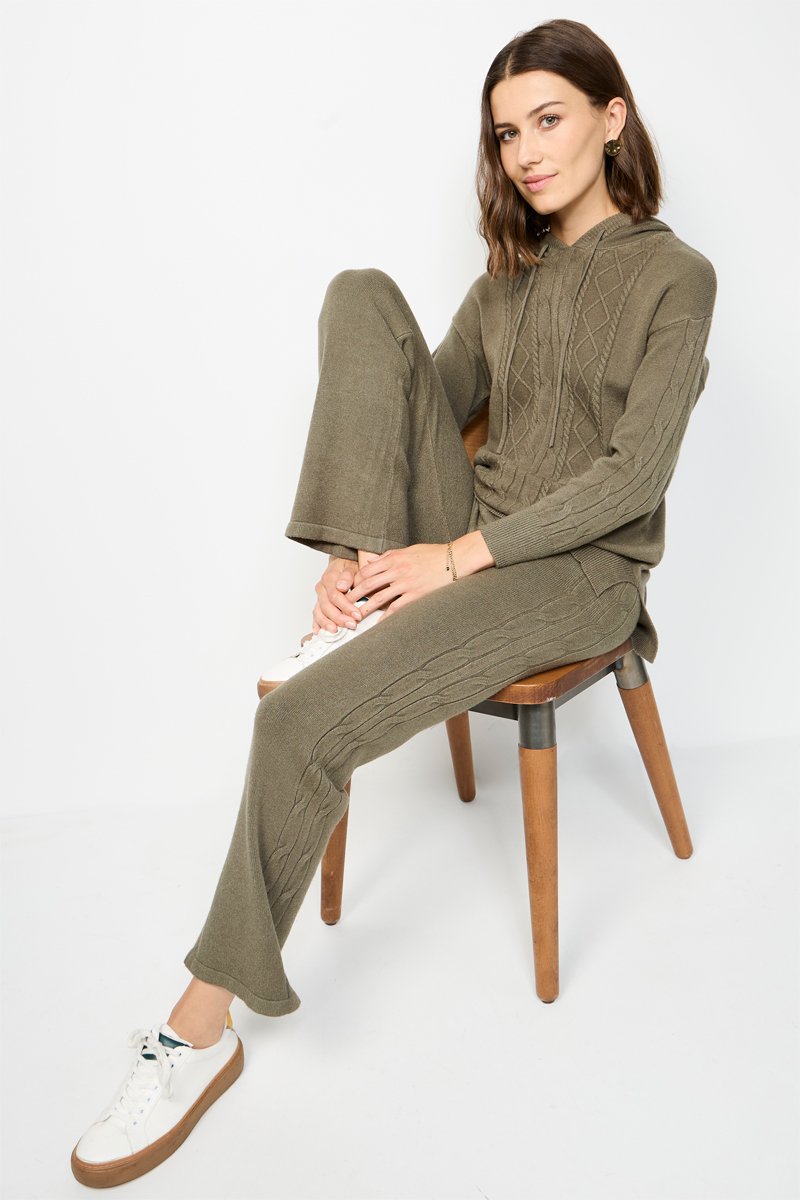 Ineengedraaid geweven op de mouwen en aan de voorkant.