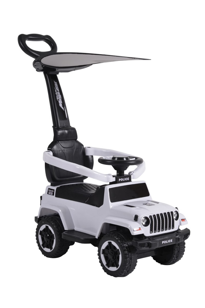 Het kind zit op de loopauto en kan vooruitgaan door met zijn voeten te duwen.