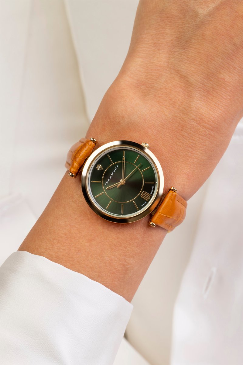 Leren Quartz Horloge met Diamant - Bruin en Goudkleurig - Monica Monaco - Monica Monaco
