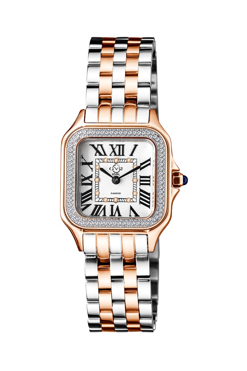 Wijzerplaat ingelegd met 12 diamanten.