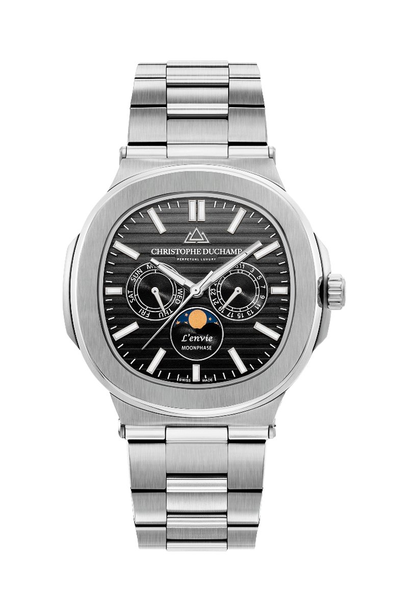 Stalen Quartz Horloge L’Envie - Maanstandweergave - Zilverkleurig en Zwart