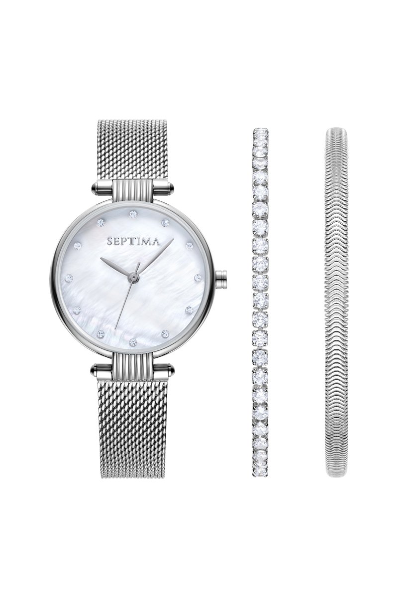 Wijzerplaat van parelmoer ingelegd met kristallen.