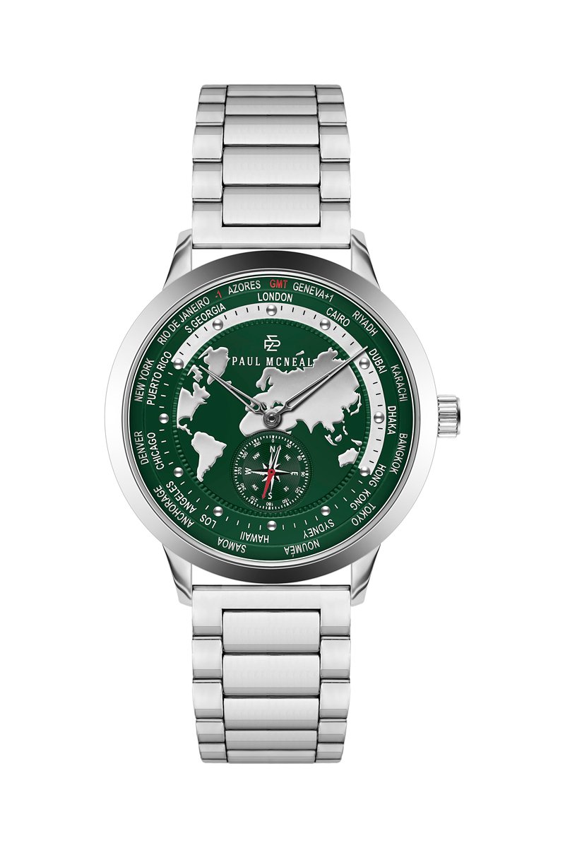 Stalen Quartz Horloge - GMT-functie - Kompas - Zilverkleurig en donkergroen